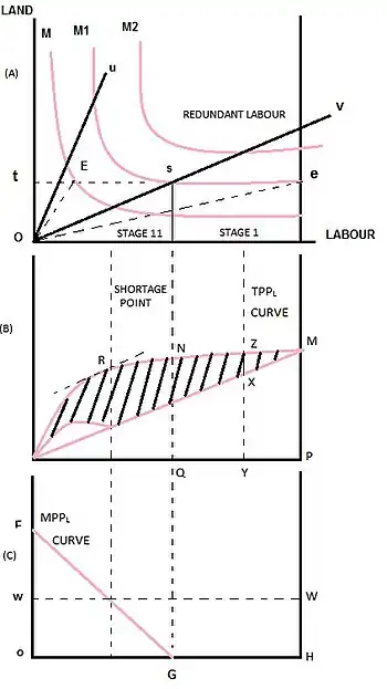 In (A), land is measured on the vertical axis, and labor on the horizontal axis. Ou and Ov represent two ridge lines, and the production contour lines are depicted by M, M1 and M2. The area enclosed by the ridge lines defines the region of factor substitutability, or the region where factors can easily be substituted. Let us understand the repercussions of this. If te amount of labor is the total labor in the agricultural sector, the intersection of the ridge line Ov with the production curve M1 at point s renders M1 perfectly horizontal below Ov. The horizontal behavior of the production line implies that outside the region of factor substitutability, output stops and labor becomes redundant once land is fixed and labor is increased.[7]