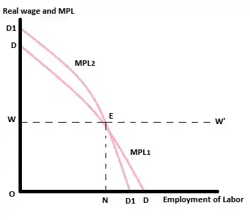 If the MPL curve changes from MPL1 to MPL2 due to a change in production technique, such that it becomes labor-saving or capital-intensive, then the surplus or profit collected would increase. This increase can be seen by comparing DWE with D1WE since D1WE since is greater in area compared to DWE. However, there is no new point of equilibrium and as E continues to be the point of equilibrium, there is no increase in the level of labor employment, or in wages for that matter. Hence, labor employment continues as ON and wages as OW. The only change that accompanies the change in production technique is the one in surplus or profits.[4]