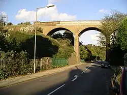 The line climbs for a short distance at 1 in 85 and swings towards the south, coming back into the suburbs of Ipswich. At milepost 73 (4.75 miles (7.64 km) from Westerfield) the line starts to drop down towards the three-arch Spring Road Viaduct, the only significant engineering feature on the branch. The train now enters a section of double track through Derby Road station (6.10 miles (9.82 km) from Ipswich station by train, but only 1.5 miles (2.4 km) on the map) where trains can pass. The line now leaves Ipswich for the last time. Just beyond milepost 78 the train passes the site of Orwell station which was closed in 1959.[2][3]