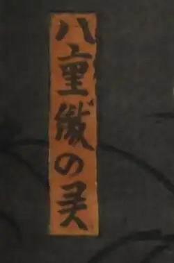 The image dates to 1852, the most productive year of Kunisada's career, during which he produced almost one thousand compositions.[32] The image depicts a scene from a kabuki play entitled Otogi banashi Hakata no imaori (御伽譚博多新織), which was staged at Edo's Nakamura-za theatre in 1852. The image takes its original title from the character represented: Yaeki hime no rei (八重機姫の霊 - the ghost of Princess Yaeki). Although not named on the print, the character was played by actor Onoe Baikō (尾上梅幸).[33][34]