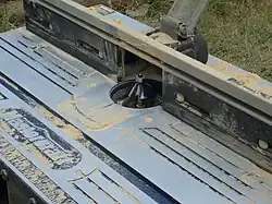 Router tables usually incorporate a fence which has a gap in the middle for the router bit. The fence can be adjusted relative to the table and router bit. Once adjusted the fence remains static, while the workpiece is guided along it.[4]: 135–136