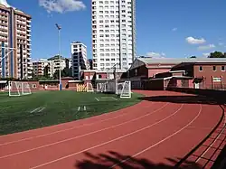 There are two football fields with artificial turf ground, both of 30 m × 50 m (98 ft × 164 ft) size. The fields are illuminated.[1]