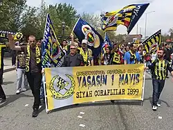 Fenerbahçe fans are mostly in Kemalist, secular and social-democratic leaning. Many Fenerbahçe fans believe that Recep Tayyip Erdoğan and the conservative Muslim Fethullah Gülen Movement are trying to gain control of the club while ex-president Aziz Yıldırım openly accused certain “elements” of trying “to seize [control of] Turkish football by influencing the state's legislative, executive and judiciary bodies to punish Fenerbahçe's Kemalist stance.”[41] As a result, Fenerbahçe supporters do not have good relations with government forces around the country, especially the General Directorate of Security.[42][43]