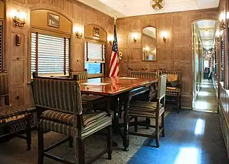 When the Ferdinand Magellan was rebuilt for service as United States Railcar No. 1, the original six bedrooms in the car were reduced to four, and the dining room and observation lounge were enlarged. Two of the bedrooms were a suite for the President and the First Lady, with a fully equipped bathroom, including a bathtub, connecting the two bedrooms. The dining room could also be used as a conference room. It has a solid mahogany table that measures 38 in × 72 in (96.5 cm × 183 cm) and seats eight. The front end of the car held quarters for two stewards, a pantry, a galley, mechanical equipment, storage and ice bunkers.