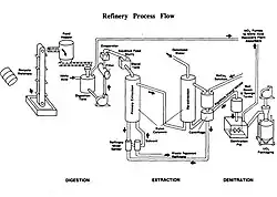 The digestion stage involved dissolving the uranium ore or scrap in large steel tanks of nitric acid (HNO3). This formed a slurry of insolubles, uranyl nitrate (UO2(NO3)2) and nitric acid.[30] For the extraction stage, the FMPC adopted a solvent extraction process developed by Harshaw that used tributyl phosphate (TBP - (CH3CH2CH2CH2O)3PO) and kerosene as an organic solvent instead of diethyl ether ((CH3CH2)2O), which Mallinckrodt used in St. Louis, and which was an explosive hazard. The process at Fernald differed from that of Harshaw in that it used a series of "pulse columns" to mix and separate the uranyl nitrate and solvent.[31] The uranyl nitrate preferentially bonded to the solvent, leaving the rest behind in what was called an aqueous raffinate.[30]