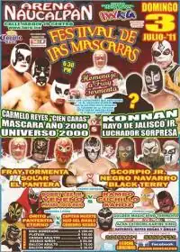 The Festival de las Máscaras (2011) (Spanish for "Festival of the Mask") was an annual professional wrestling major event produced by Mexican professional wrestling promotion International Wrestling Revolution Group (IWRG), which took place on August 2, 2011 in Arena Naucalpan, Naucalpan, State of Mexico, Mexico. For this annual event the "Comisión de Box y Lucha Libre Mexico D.F." (Mexico City Boxing and Wrestling Commission) allowed wrestlers who had previously been unmasked after losing a Luchas de Apuestas, or bet match, to wear their masks again. The main event of the show heralded back to long running storyline feuds between Rayo de Jalisco, Jr., El Canek and Konnan against the brothers known as Los Hermanos Dinamita (Cien Caras, Máscara Año 2000 and Universo 2000). Cien Caras had originally lost his mask to Rayo de Jalisco, Jr. and Universo 2000 was unmasked by El Canek, but for one night they were allowed to wear the masks again as they wrestled against their longtime rivals.