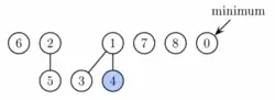 3. Search the final list of roots to find the minimum, and update the minimum pointer accordingly. This takes time, because the number of roots has been reduced.