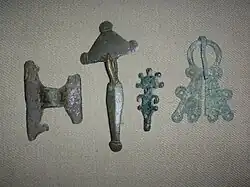 There are numerous types of post-Roman fibulae. The so-called Gothic group of bow fibulae have a round or triangular flat head plate, often with 3, 5 or 7 knobs, a small arched bow and a long flat diamond shaped foot.