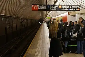 The southbound platform contains an exhibit called The Subway: Design for a Modern Icon, developed by the MTA in conjunction with MoMA.[36] Installed in January 2020, it contains excerpts of icons used throughout the New York City Subway system.[37][38] These include several pages of the "New York City Transit Authority Graphic Standards Manual", portions of the 1972 New York City Subway map, a visual timeline, and quotations.[36]