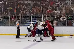 Despite the bans, there have been fights in European leagues. In 2001, a game between the Nottingham Panthers and the Sheffield Steelers in the British Superleague saw "some of the worst scenes of violence seen at a British ice hockey rink".[51] When Sheffield enforcer Dennis Vial crosschecked Nottingham forward Greg Hadden, Panthers enforcer Barry Nieckar subsequently fought with Vial, which eventually escalated into a 36-man bench-clearing brawl. Referee Moray Hanson sent both teams to their locker rooms and delayed the game for 45 minutes while tempers cooled and the officials sorted out the penalties. Eight players and both coaches were ejected, and a British record total of 404 penalty minutes were incurred during the second period. The league handed out 30 games in suspensions to four players and Steelers' coach Mike Blaisdell and a total of £8,400 in fines.[51][52][53] Russia's Kontinental Hockey League (KHL) had a bench-clearing brawl between Vityaz Chekhov and Avangard Omsk in 2010. Officials were forced to abandon the game as there were only four players left. Thirty-three players and both teams' coaches were ejected, and a world record total of 707 penalty minutes were incurred during the game.[54][55] The KHL imposed fines totaling 5.7 million rubles ($191,000), suspended seven players, and counted the game as a 5–0 defeat for both teams, with no points being awarded.[56]