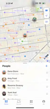Find My allows users to share their device locations to contacts with an iOS, iPadOS, or macOS device for an hour, until the end of the day, or indefinitely. Once shared, others are able to see the exact location of a person's device on a map and can receive directions to the person's location. Notifications can be set, alerting a user when someone leaves or arrives at a set location.[18]