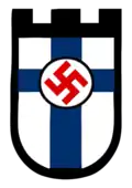 The name of the KUT was changed to SKT in October 1940. The change was justified by the fact that the KUT's policies were fully in line with the basic ideas of Nazism. At the same time, an organization logo was introduced: a shield with the Finnish flag, a red swastika circled in the middle of the cross on a white background. The formal founding meeting of SKT was held on November 8, 1940. In addition to Snellman, the founding members were Eino Tilus and Arvi Nuorimo. SKT was entered in the register of associations in April 1940.[6] In the summer of 1941 SKT already had 49 local chapters and multiple chapters in Helsinki.[7]