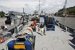 However, as the advancing system can only be used effectively in calm seas with significant wave height below one metre, Louhi is also equipped with a special "wave damping tank", an innovation used for the first time in a Finnish recovery vessel, that can be used in combination with the aforementioned stiff brush conveyors and a shorter sweeping boom to collect oil in 2-metre (7 ft) swell. The system consists of a dampening channel that guides the oil to the recovery system on the other side of the ship.[16] Spilled oil surrounded by oil booms can also be collected by two free-floating skimmers connected to the vessel by a flexible pipe.[3][17]