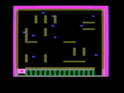 The player controls a "firebug," a 3-by-3-pixel square with a tail stretching behind it. The player picks up gas cans—each represented by a single pixel—and drops a can by pressing the joystick button. The end of the player's tail glows white, and ignites any gas can that it is adjacent to, including cans the player had dropped. Once a gas can ignites, it burst into colorful flames, which ignites any walls they touch.