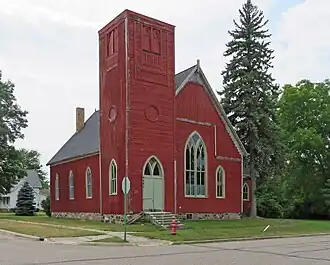 The Red Church is an L-shaped, gable-roof, frame structure located at the intersection of Second and School Streets. The church measures 60 feet by 38 feet, and has an asymmetrical front façade, with a tower at the front corner nearest the intersection. The exterior is clad in vertical board and batten siding, with the exception of the front of the tower and front wall of the sanctuary below the gable, where the siding consists of horizontal boarding. The church is nominally Gothic in style, with a steeply pitched roof and Gothic arched head openings for the door and windows. The interior contains a small vestibule in the tower base, with the sanctuary behind. Two sets of folding doors connect the sanctuary to the adjacent lecture room. Only a few pews remain in the sanctuary, but the original interior surface treatments remain, including matched board dados and ceiling.[2]