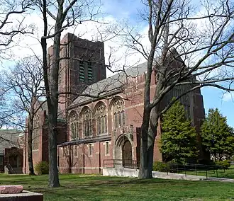 Designed by the architect Ralph Adams Cram (1863–1942), the church was built between 1908 and 1910 and is a Neo-Gothic-style building laid out in a traditional cruciform plan. It is constructed of brick with concrete trim and a steeply sloping slate-covered roof. Connected to the church are a parish hall and manse. The surrounding landscape, designed by the Olmsted Brothers, is a contributing element to its designation of historic significance.[2]