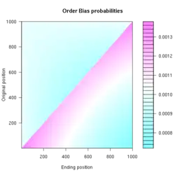 The matrix to the right shows the probability of each element in a list of length 7 ending up in any other position. Observe that for most elements, ending up in their original position (the matrix's main diagonal) has lowest probability, and moving one slot backwards has highest probability.