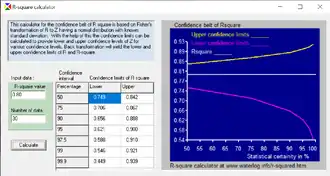 The application of Fisher's transformation can be enhanced using a software calculator as shown in the figure. Assuming that the r-squared value found is 0.80, that there are 30 data , and accepting a 90% confidence interval, the r-squared value in another random sample from the same population may range from 0.656 to 0.888. When r-squared is outside this range, the population is considered to be different.