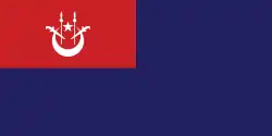 State and war ensign | A blue field with a white crescent and star and two white kris and spears in a red canton. |