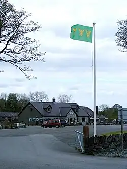 The Caernarfonshire flag (Welsh: Baner Sir Gaernarfon) is the flag of the historic Welsh county of Caernarfonshire. The origins of the emblem of the three eagles arranged in fess on a green field revolve around the ancient King of Gwynedd, Owain Gwynedd, to whom the symbol was attributed as his coat of arms. It was registered with the Flag Institute in March 2012.[1]