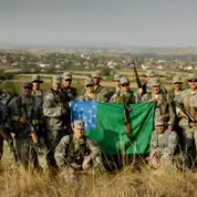 Today the flag is used as the regimental flag of the Vermont National Guard unit. The regimental flag, known also as a "battle flag" or war flag, accompanies the unit on battle assignments and is physically handed to the commander of the regiment, as described by former Vermont National Guard Adjutant General Martha Rainville in an interview.[6] The flag is also a symbol of the Vermont secessionist movement. The Castleton University football team has also featured the flag in its pre-game ceremonies since its inception in 2009. Proposals have been considered to change the state flag of Vermont back to the flag of the Green Mountain Boys' design, but none have succeeded.[7]