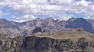 Flagstone Peak (13,456 ft (4,101 m)) is located in the Wind River Range in the U.S. state of Wyoming.[3] The peak is the 12th highest peak in Wyoming.[4] The summit is located on the Continental Divide and is in both Shoshone and Bridger-Teton National Forests. The Flagstone Peak-Southeast Peak (13,160 ft (4,010 m)) lies .25 mi (0.40 km) to the southeast.