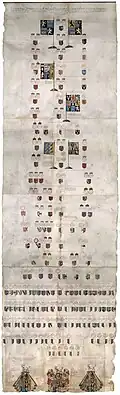 A genealogy chart perused by William Segar, Garter Principal King of Arms,[10] on 19 June 1632, is kept in deposit by the Nordic Museum.[11] It depicts lineal descents and portrays the achievement of Sir George Fleetwood, Edward Fleetwood of Penwortham and Sir William Fleetwood of Misseden.