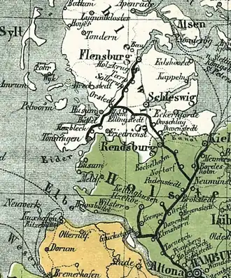 The Flensburg-Husum-Tönninger Railway Company (Danish: Flensborg-Husum-Tønning jernbaneselskab, German: Flensburg-Husum-Tönninger Eisenbahngesellschaft, FHTE) was owned by the British entrepreneur, Sir Samuel Morton Peto and built its trunk line during the reign of Frederick VII of Denmark from 1852 to 1854. The company also built the port railways in Flensburg and Tönning. A major reason for the creation of a rail link between the Baltic port of Flensburg and the North Sea ports of Husum and especially Tönning on the Eider estuary was the export of live cattle to England. A temporary station was commissioned on 1 April 1854 and the permanent “English" station was fully opened in Flensburg on 4 October 1854, with a formal inauguration by the King on 25 October. At the same time, an important branch line was opened from Oster-Ohrstedt via Klosterkrug (now a station in the city of Schleswig) to Rendsburg, connecting to the Neumünster–Rendsburg line—opened on 18 September 1845 by the Rendsburg-Neumünster Railway Company (Rendsburg-Neumünsterschen Eisenbahn-Gesellschaft, RNE)—which in turn connected with the Hamburg-Altona–Kiel line. An extension to the north from Holzkrug in Flensburg to Haderslev (now in Denmark) was completed on 2 May 1866. The year before the railway had been incorporated into the Schleswig Railway Company (Schleswigschen Eisenbahn).