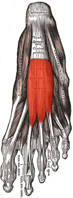 The flexor digitorum brevis or flexor digitorum communis brevis[1] is a muscle which lies in the middle of the sole of the foot, immediately above the central part of the plantar aponeurosis, with which it is firmly united.
