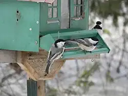 By living in a large flock, birds can to attack the predator with a stronger force compared to if the bird was on its own. Flocks of black-capped chickadees have shown the ability to produce a mobbing call when they visualize a possible predator.[8] In response, the individual black-capped chickadees surround the predator and attack it in a mob-like fashion to force the predator to leave.[2] This is known as mobbing.[2] This mobbing behaviour is quickly learned by the juveniles within a flock meaning that these individuals will be better equipped as adults to ward off predators and respond rapidly when a predator is in sight.[2]