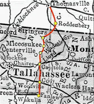 The first 10 miles (16 km) ran from Thomasville to the lumber mill in Metcalf, Georgia, then on to Roddenberry. The Florida Central ran parallel to part of an Atlantic Coast Line Railroad line, crossing the ACL near the Florida/Georgia border and then running south to Stringers in extreme northeastern Leon County. From there the FC ran to Miccosukee and Wadesboro in Leon County, then to Capitola in Leon County (where it crossed the Seaboard Air Line Railroad), Cody in Jefferson County, terminating at Fanlew.[1]