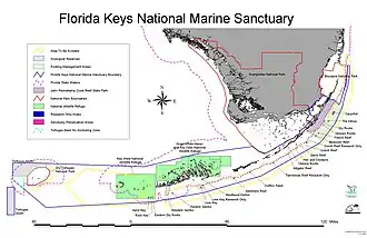 The Florida Keys National Marine Sanctuary is a U.S. National Marine Sanctuary in the Florida Keys. It includes the Florida Reef, the only barrier coral reef in North America[1] and the third-largest coral barrier reef in the world. It also has extensive mangrove forest and seagrass fields. The Florida Keys National Marine Sanctuary, designated on December 28, 1990,[2] was the ninth national marine sanctuary to be established. The Florida Keys National Marine Sanctuary protects approximately 2,900 square nautical miles (9,947 km2; 3,840 sq mi) of coastal and ocean waters from the estuarine waters of South Florida along the Florida Keys archipelago and the Hawk Channel passage, encompassing more than 1,700 islands, out to the Dry Tortugas National Park, reaching into the Atlantic Ocean, Florida Bay, and the Gulf of Mexico.