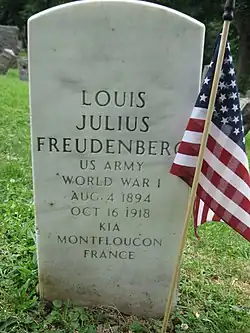 Headstones of interest include those of American Civil War soldiers Decatur Dorsey and Christian Woerner, and the side-by-side headstones of World War I Army privates Horace Shields and Freeman Norris, who died just over a month apart in June and July 1949. One headstone regarded as among the most interesting is the faux tree-trunk of Frank and Sally Bello, who died in 1956 and 1992, respectively, and which was dedicated by their children. Among those regarded as the most poignant are the Guidotti plot and the Adolph Lankering Family Vault. The former includes a four-foot-tall headstone with a right-hand side column with a curled leaves etching. At the top of the column is depicted a tree branch cross and roses, and chiseled oval spaces for the four children, two of which are filled as of 2013.[8]