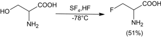 A solution of sulfur tetrafluoride in hydrogen fluoride converts hydroxy-containing amino acids to the fluoro amino acids:[5]