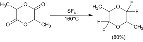 Carbonyl compounds generally react with SF4 to yield geminal difluorides. Reaction times tend to be on the order of hours and yields are moderate.[7] Fluorination of lactones can provide heterocyclic fluorides, although ring opening has been observed for γ-butyrolactone. The six-membered lactide does not experience ring opening.[8]
