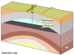 Anticlinal traps are formed by folding of rock. For example, if a porous sandstone unit covered with low permeability shale is folded into an anticline, it may form a hydrocarbons trap, oil accumulating in the crest of the fold. Most anticlinal traps are produced as a result of sideways pressure, folding the layers of rock, but can also occur from sediments being compacted.[24]
