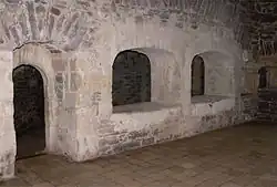 The kitchens at Linlithgow Palace are on three levels within the tower at the north end of the Great Hall. They were modified in 1464, 1470–1, and 1539. Some alterations were occasioned by subsidence. The court kitchen is adjacent to the Great Hall. The room next door was probably the spice house.[21] In August 1539 James Hamilton of Finnart was paid for rebuilding the king's kitchen with a fireplace, an oven, and a room for silver vessels, and another for keeping coal.[22] There is a well in the lower "laich" kitchen.[23]