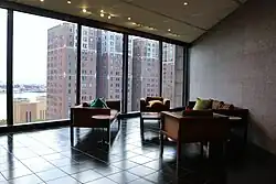 The elevators and one set of emergency stairs are on the western side of the building, near the northwest corner. Another set of emergency stairs are on the northeast corner. There are also emergency stairs within the diagonal piers on the eastern and southern sides of the building, at the ends of the northern and western wings respectively.[18][47] The Ford Foundation's library, which originally included 18,000 volumes, is located beneath the lobby.[27] The basement has a conference room and an auditorium,[27][69] the latter of which is decorated with a tapestry by Sheila Hicks.[70][50] There are 54,000 square feet (5,000 m2) of event space, as well as an art gallery and office space, all of which can be rented out.[50]
