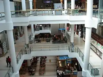 The old, outdoor shops were demolished in August 1987 except for a row of three stores next to the Mahoneys Road pedestrian entrance, which remain there today. The split-level indoor "Marketplace" addition, completed in 1976, was also retained but majorly reconfigured to accommodate new tenancies including a multi-level Harris Scarfe store.[85]T he first stage of the expanded centre opened on 12 September 1989, and 113 shops were operating by July 1990.[86] The second stage of the redevelopment was officially completed by December 1990.[77] Fifty-nine shops from the old section were relocated to the new centre. The Hoyts 10 cinema complex opened on the third level on 26 December 1989 with 10 screens and 2,500 seats.[87][88]