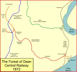 Much of the land was leased from the Crown at a rent of £100 a year, and the company was required to fence it throughout. It was decided that the sections from the South Wales Railway to New Fancy Colliery, and from Moseley Green to Foxes Bridge with the branch at Brimspill, should be built in two successive years. Plans were already being made for extending the line, and on 29 November 1856 an application was published for the Forest of Dean Central, Lydbrook & Hereford, Ross & Gloucester Junction Railway. This would extend the Forest of Dean Central Railway to the Hereford, Ross and Gloucester Railway line near Mitcheldean Road station, with a later extension to Ledbury. This was presented to Parliament in the 1857 session, but in fact no powers for the work were obtained. (In the 1870s a line was built on part of the intended route by the Mitcheldean Road and Forest of Dean Junction Railway.)[1][3]