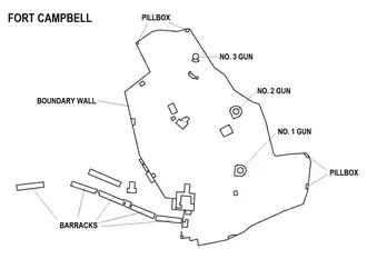 Fort Campbell's design is similar to other fortifications built before and during World War II throughout the British Empire, such as Fort Stanley in Hong Kong, Good Head Battery in New Zealand, Brownstone Battery in Devon, and Fort South Sutor in Scotland.[2]