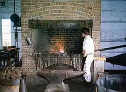 A museum interpreter and reenactor working the fort's blacksmith shop. The fort operates as a living museum.