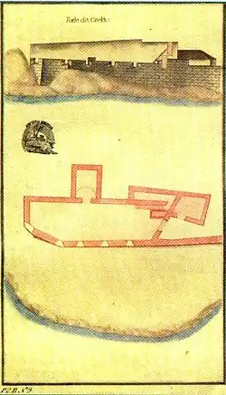 The bastion fortification has an organic plan, adapted to the terrain, with walls in stonework, broken by four canon emplacements oriented to the bay, while two towards the south.[6] The gunpowder magazine was partially excavated into the cliff face of the flank along the promontory of Santa Catarina. There are still vestiges of barracks and an earthen kiln to produce the ammunition.