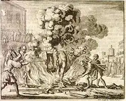This square was possibly part of Constantine the Great's original city plan design;[1] like the other fora of Constantinople, it was certainly built sometime in the 4th century.[1] The name of the square originated from a large, hollow bronze statue representing the head of an ox.[1][2] The statue, brought to Constantinople from Pergamum in Asia Minor, was used both as a furnace and a device implementing the brazen bull torture: people were closed inside the ox, which then was heated until they suffocated and burned.[1][2] During the first persecution of Christians in Asia Minor under Emperor Domitian (r. 81–96) the Ox, still in Pergamum, was used to execute Saint Antipas.[2] According to the Patrologia Latina, in the reign of Julian, the Apostate (r. 361–363) many Christians were burned inside the Bull, and at that time already moved to Constantinople.[3] In 562 the Forum, at that time surrounded by warehouses and workshops, burned down.[1] The body of the usurper Phocas (r. 602–610) was also incinerated in the ox's head following his deposition.[1][3] According to some sources,[3] Emperor Heraclius (r. 610–641) melted the statue to mint coins needed to pay his army for his war against the Persians. However, this is not certain since executions using the Ox continue to be attested after Heraclius's reign, for example, when Justinian II (r.685-695; 705–711) let burn in the Ox the two Patricians Theodoros and Stephanos, both involved in a failed plot against him.[3] The same Emperor enlarged and adorned the square.[4] During the Byzantine Iconoclasm, Saint Theodosia (d. 729) and Saint Andrew of Crete (d. 766), both defenders of icon veneration, were executed in the square.[3] The former was executed by having a ram's horn hammered through her neck.[5]