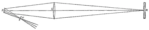 It was seen in Figure 1 that Foucault placed the rotating mirror R as close as possible to lens L so as to maximize the distance between R and the slit S. As R rotates, an enlarged image of slit S sweeps across the face of the distant mirror M. The greater the distance RM, the more quickly that the image sweeps across mirror M and the less light is reflected back. Foucault could not increase the RM distance in his folded optical arrangement beyond about 20 meters without the image of the slit becoming too dim to accurately measure.[7]