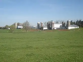 Farm buildings include frame and masonry dairy/hay barns, silos, a milk house, workshop, equipment sheds, cattle pens, and tenant houses. The farm produced tobacco from 1919 until 1925; beginning in 1925, the farm turned to dairy production with a 100-head Holstein-Friesian herd.