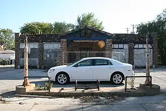 The Four Nineteen Building is a historic gas station building located at 419 E. 83rd St. in the Chatham community area of Chicago, Illinois. The station was built in 1928 by William D. Meyering and David L. Sutton, two local real estate businessmen. The station is an example of the Domestic style of gas station architecture, in which stations were designed to resemble small houses. A wooden canopy supported by brick piers covers the building's front entrance and two garage bays extend from either side, making the station part of a subtype of the Domestic style appropriately named "House with Canopy and Bays". The station's walls are built with clinker bricks laid in a skintled pattern, a combination of two Chicago construction innovations. Clinker bricks were heated at higher temperatures than standard bricks, making them swollen, dense, and differently colored; the bricks were generally discarded until the 1920s, when Chicago architects began to build with them. The skintled pattern of brickwork consisted of rough and irregular bricklaying in which bricks stuck out of and into the wall at different angles. The building's parapet roof is tiled with multicolored Ludowici clay tiles, which were thought to pair well with skintled walls by architects of the era. Gas stations constructed from the 1930s onward generally had more functional designs, and as of 1999, the Four Nineteen Building was one of only sixteen Domestic-style gas stations remaining in Chicago and one of three with both a canopy and bays.[2]