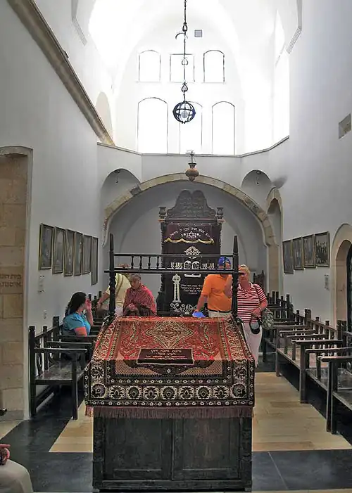 According to legend, the Yochanan ben Zakai Synagogue (Hebrew: בית הכנסת יוחנן בן זכאי), also known as Kahal Kadosh Gadol, is believed to stand on the spot of the Beit Midrash of the tanna Rabban Yochanan ben Zakai,[6] who established the Sanhedrin in Yavneh after the destruction of the Second Temple. The current building was constructed at the beginning of the 17th century, and by 1947, it was the largest synagogue of the Sephardic community in Jerusalem.[7] Since the end of the 19th century, it has served as the site of the Sephardic Chief Rabbi's installation.[8]
