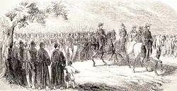 The Japanese soon responded to these contacts by sending their own embassies to France. The shōgun sent the First Japanese Embassy to Europe, led by Takenouchi Yasunori in 1862.[21] The mission was sent in order to learn about Western civilization, ratify treaties, and delay the opening of cities and harbour to foreign trade. Negotiations were made in France, the UK, the Netherlands, Prussia and finally Russia. They were almost gone an entire year. On April 13, 1862, the first Japanese Minister to France delivered his credentials to Napoleon III in the Tuileries palace.[22]