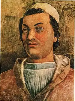 At the request of his cousin, Albert III, the Elector of Brandenburg, Francesco was elevated, on 18 December 1461,[4] at the age of seventeen to the rank of Cardinal by Pope Pius II after the Pope had been in Mantua for eight months for the council held in that city. The meeting between the father, Ludovico III, the Marchese di Mantova, and the son, the new Cardinale di Mantova, coming to his hometown for the consecration as a cardinal, was recorded in the frescoes of Andrea Mantegna's Camera degli Sposi ( Italian, "Chamber of the Bride" ). Francesco was the first of the ten members of the House of Gonzaga to be given the red biretta of the cardinal and he was assigned to Santa Maria Nuova,[5] a church near the Via Sacra in Rome.